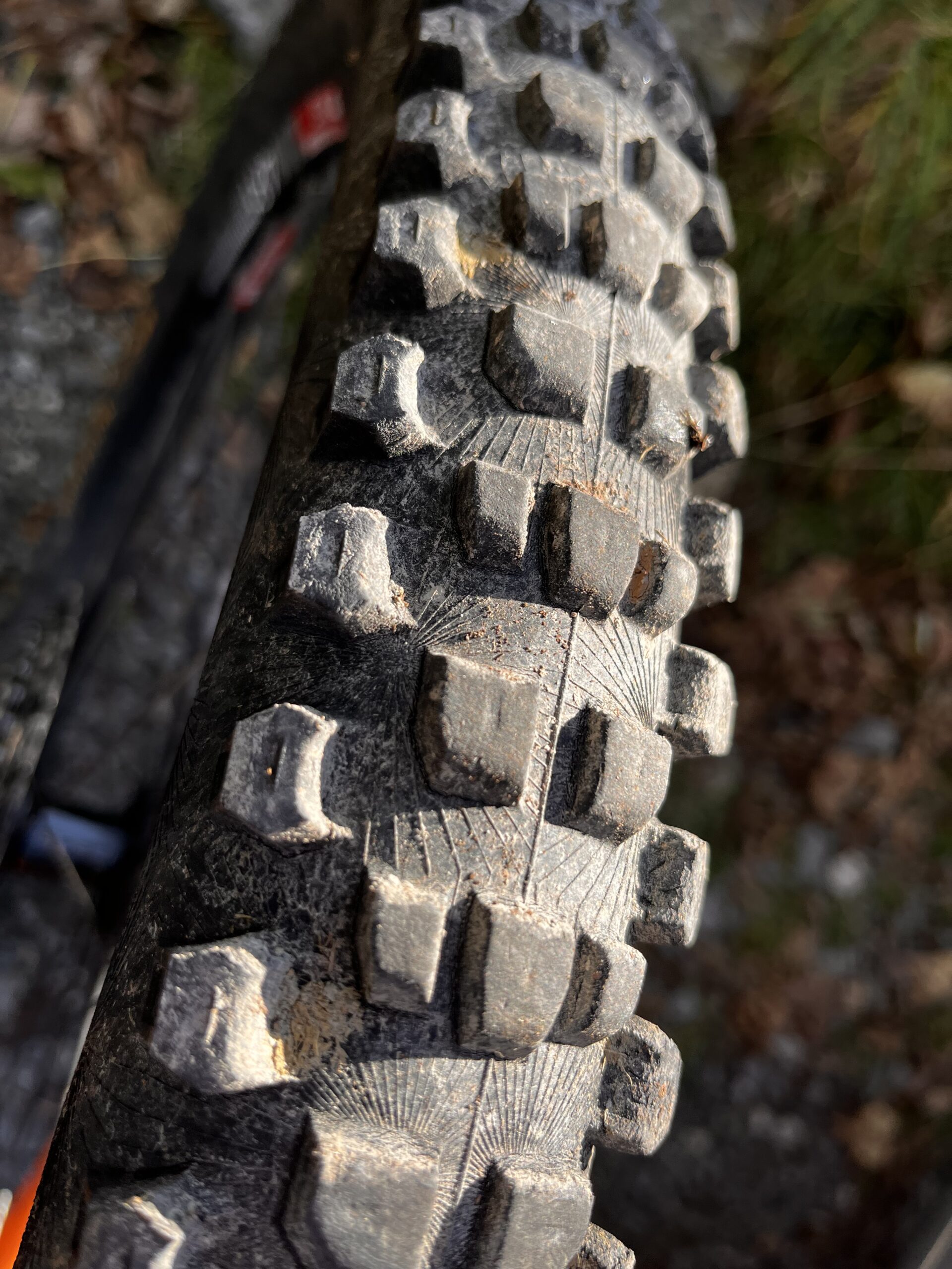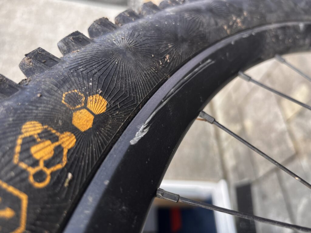 To the end of the life of the rear 2.4 enduro casing version, I picked up a couple of holes that needed plugging with a tyre insert sausage. These happened in close succession and on very different instances. One fast and in flowing but rocky trail and the other on a slow traverse trail that was janky and trials like in places.